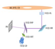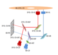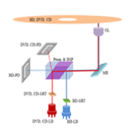 | Features | Implementing Blue Ray by making use of a pair of components | A single component used on OL; however, prism of higher cost or multiple MR’s used | Achieving compact design and cost saving by making use of 3-wavelength integrated optical components |